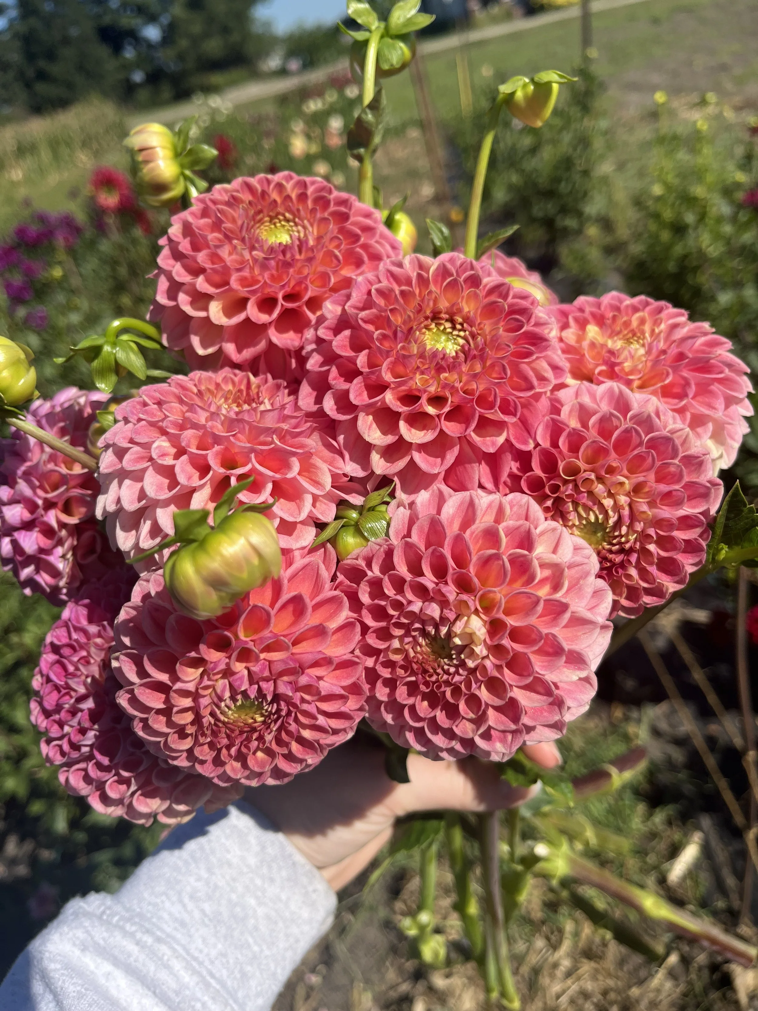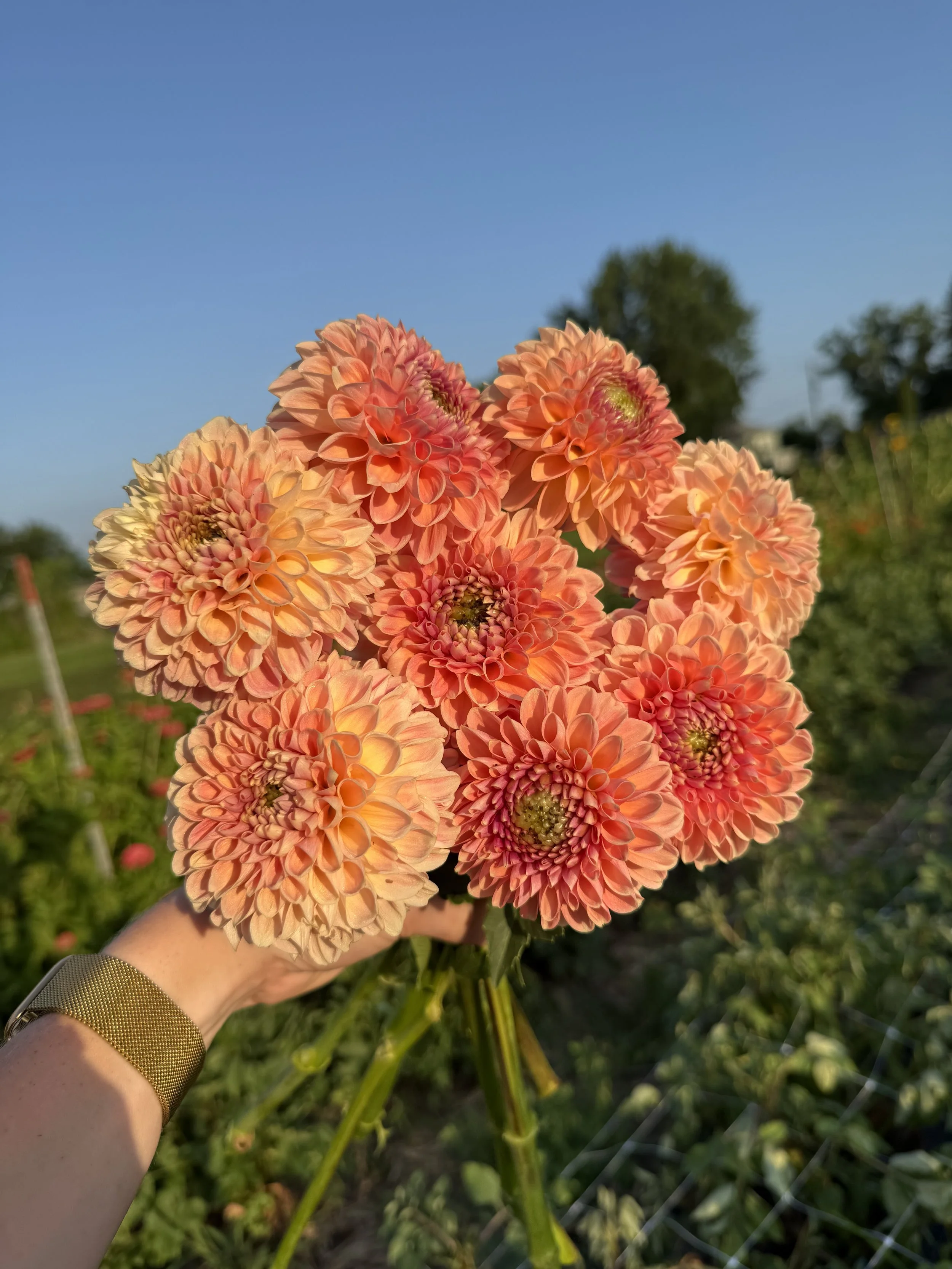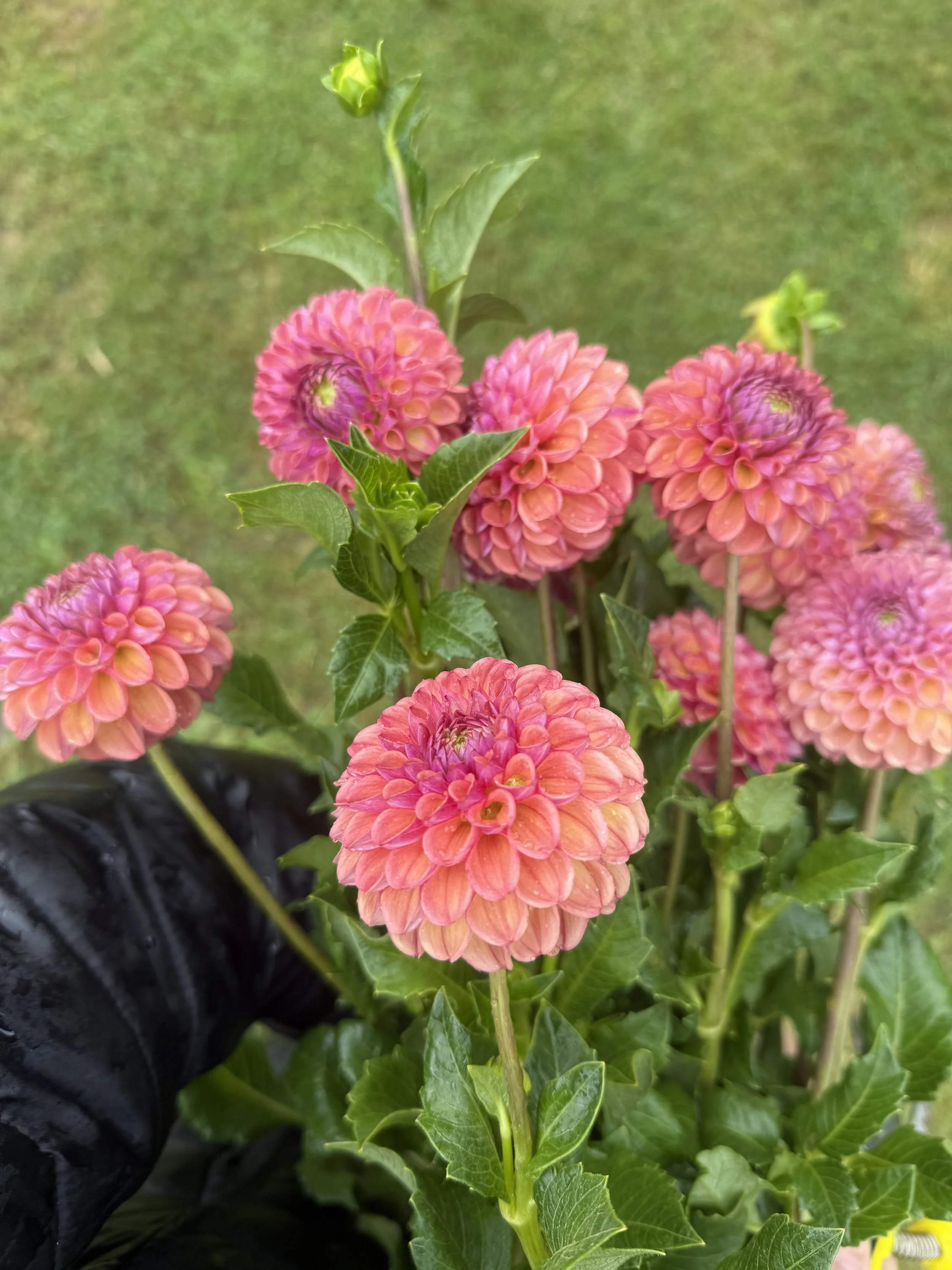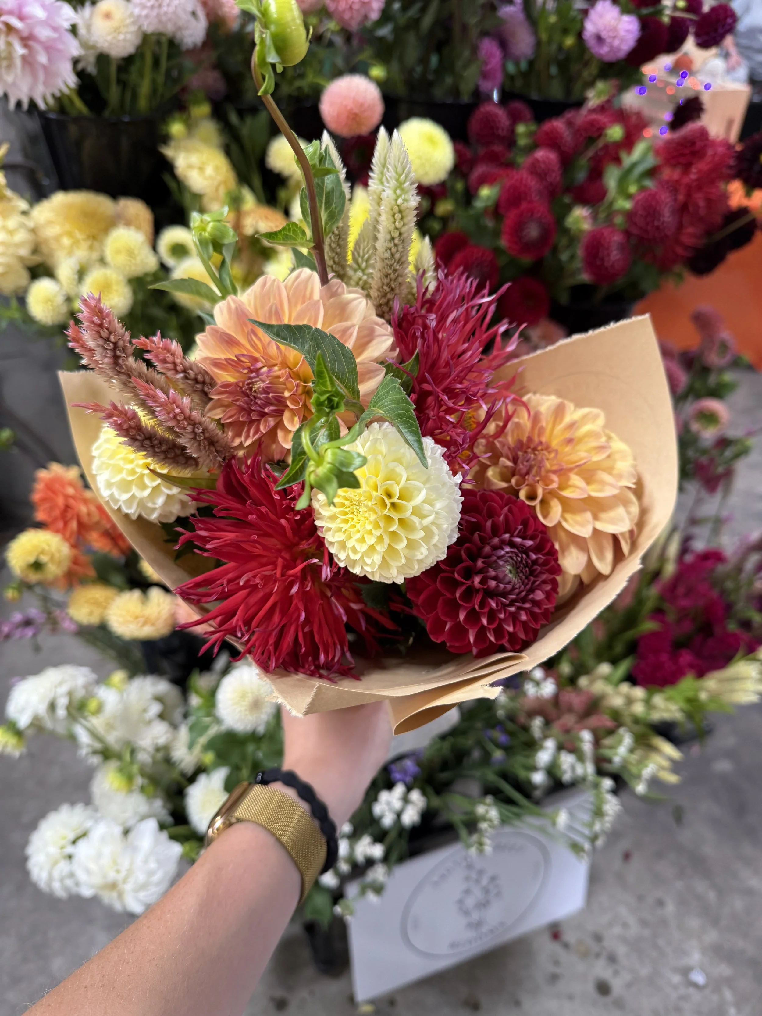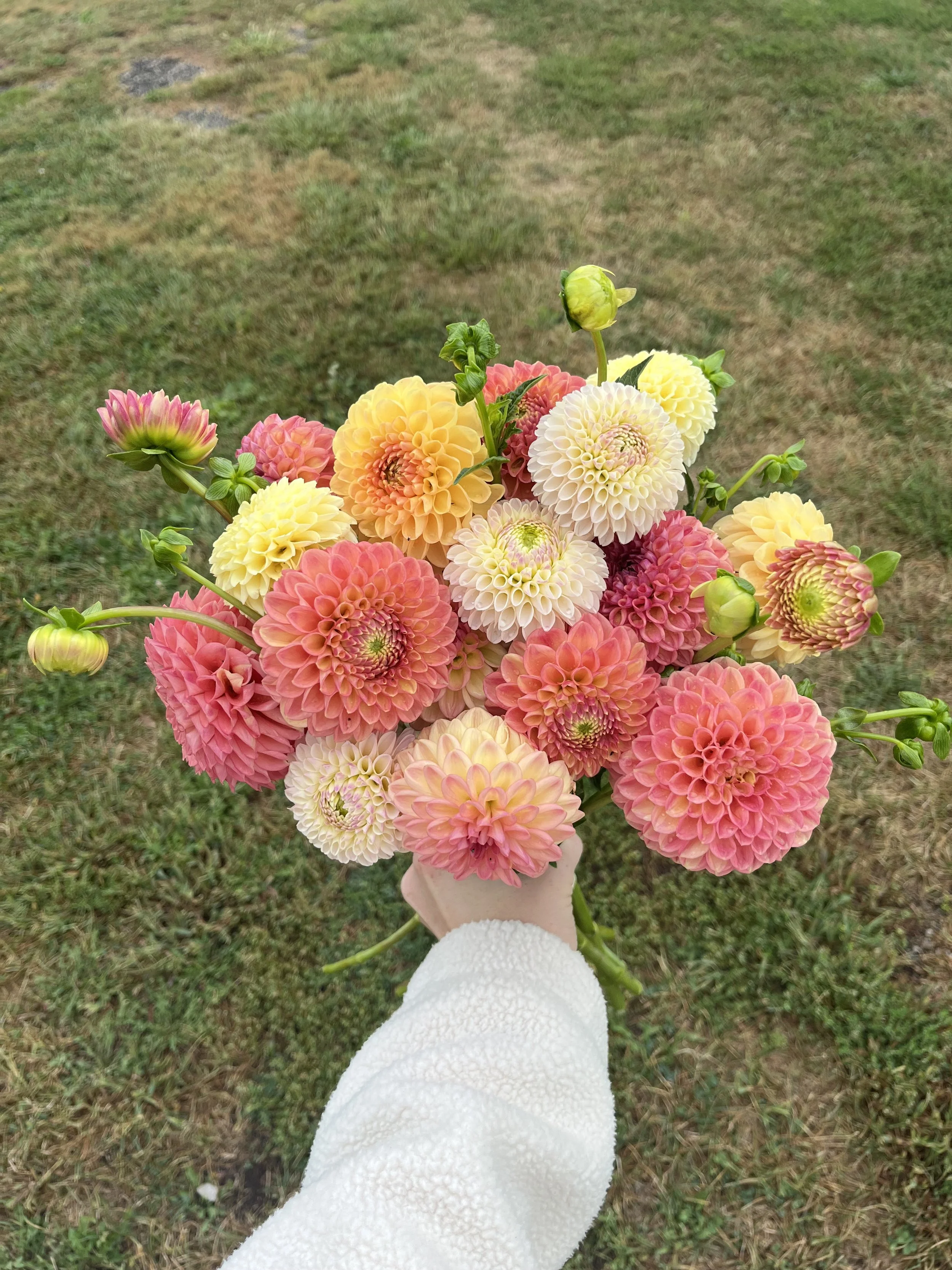 A hand holding a colorful bouquet of dahlias in shades of pink, yellow, orange, and cream, over a grassy background.
