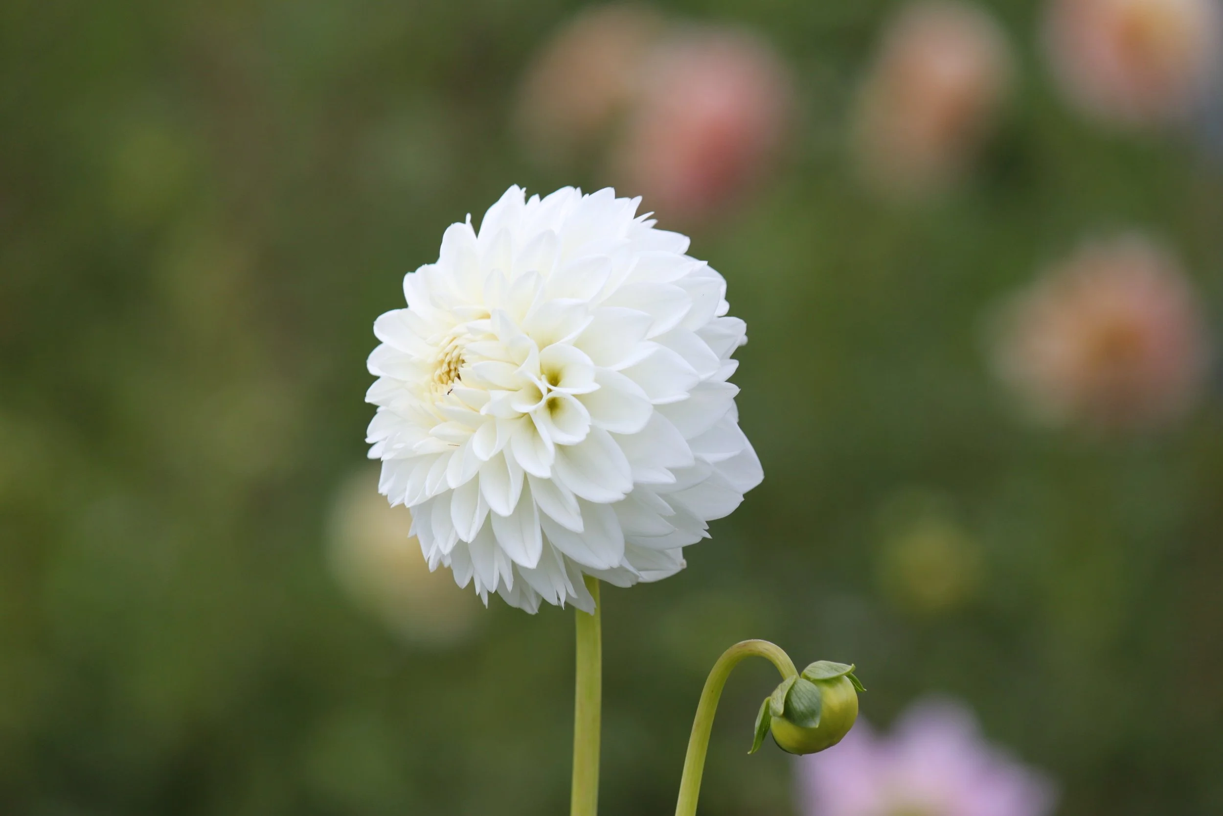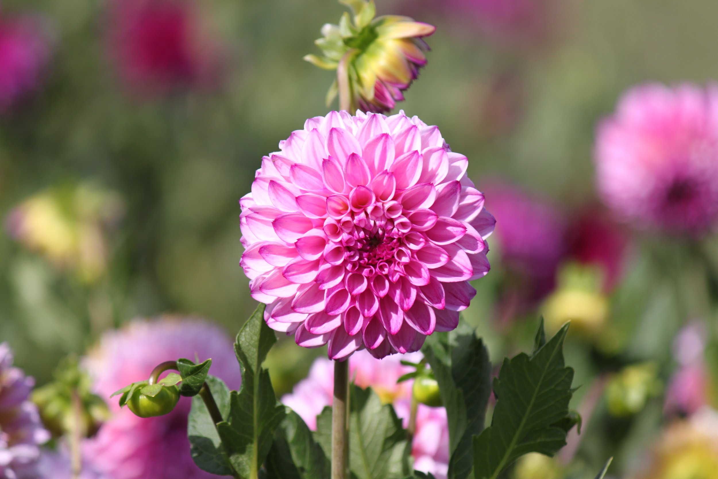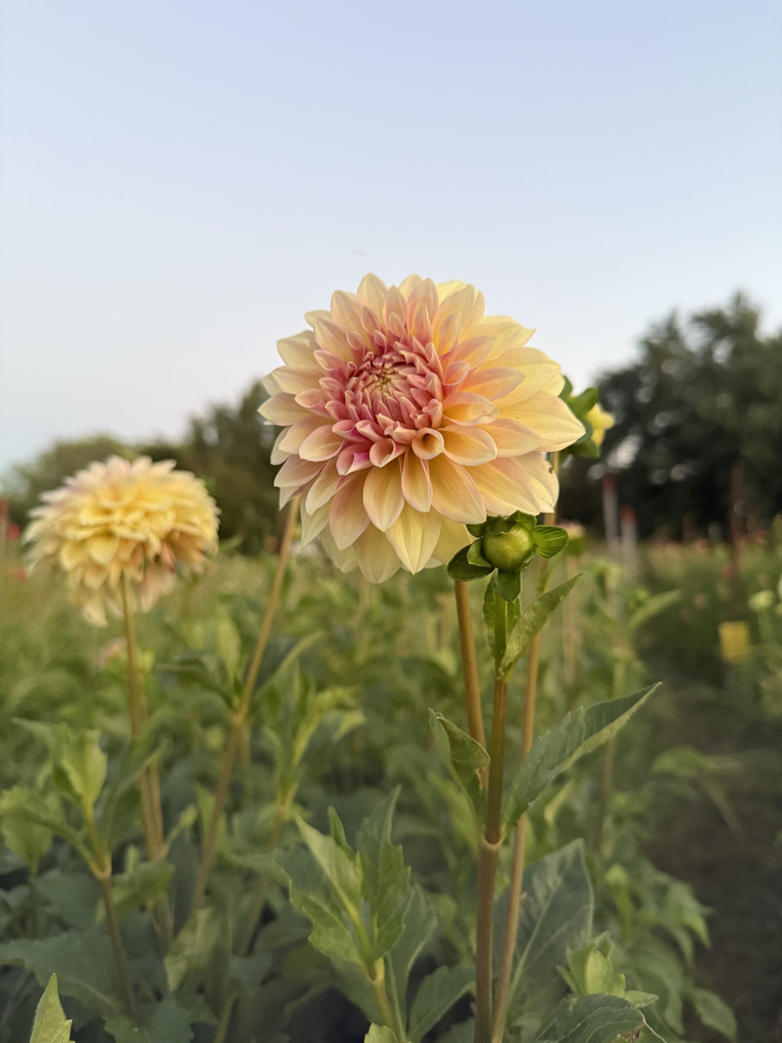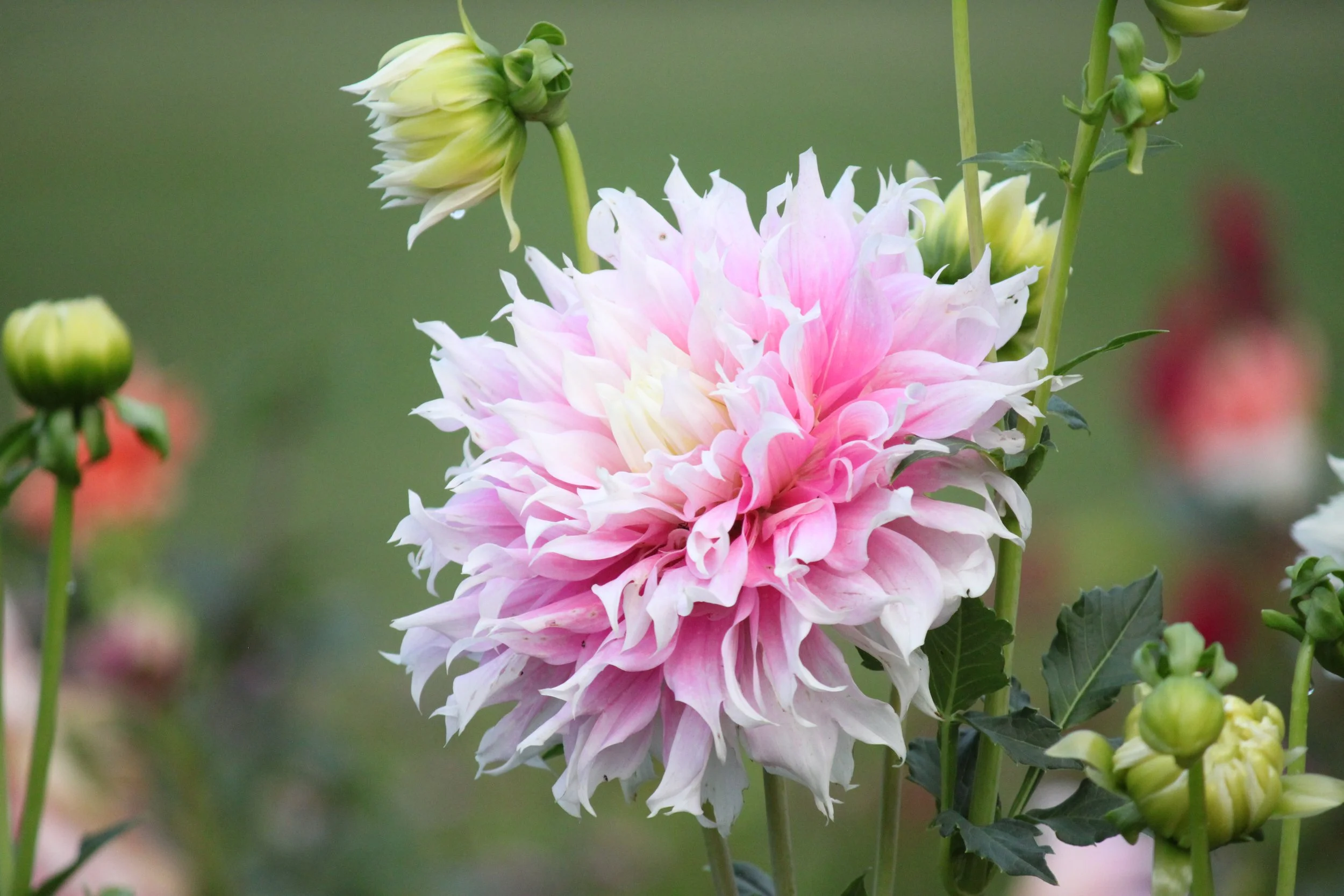 Close-up of a large pink and peach-colored dahlia flower with layered petals and green buds nearby.