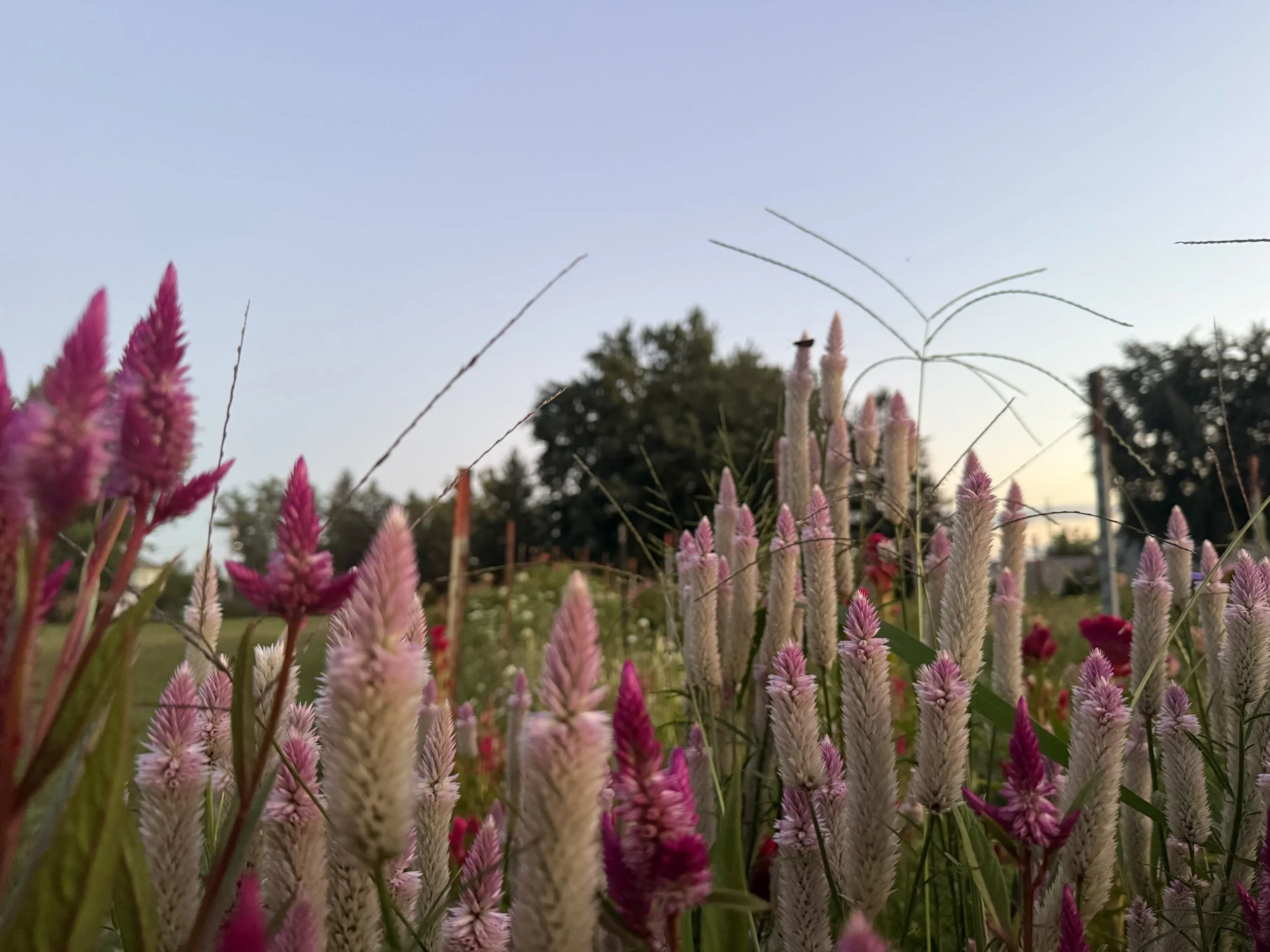 Close-up of pink, white, and purple flowers in a field with trees and a clear sky in the background.