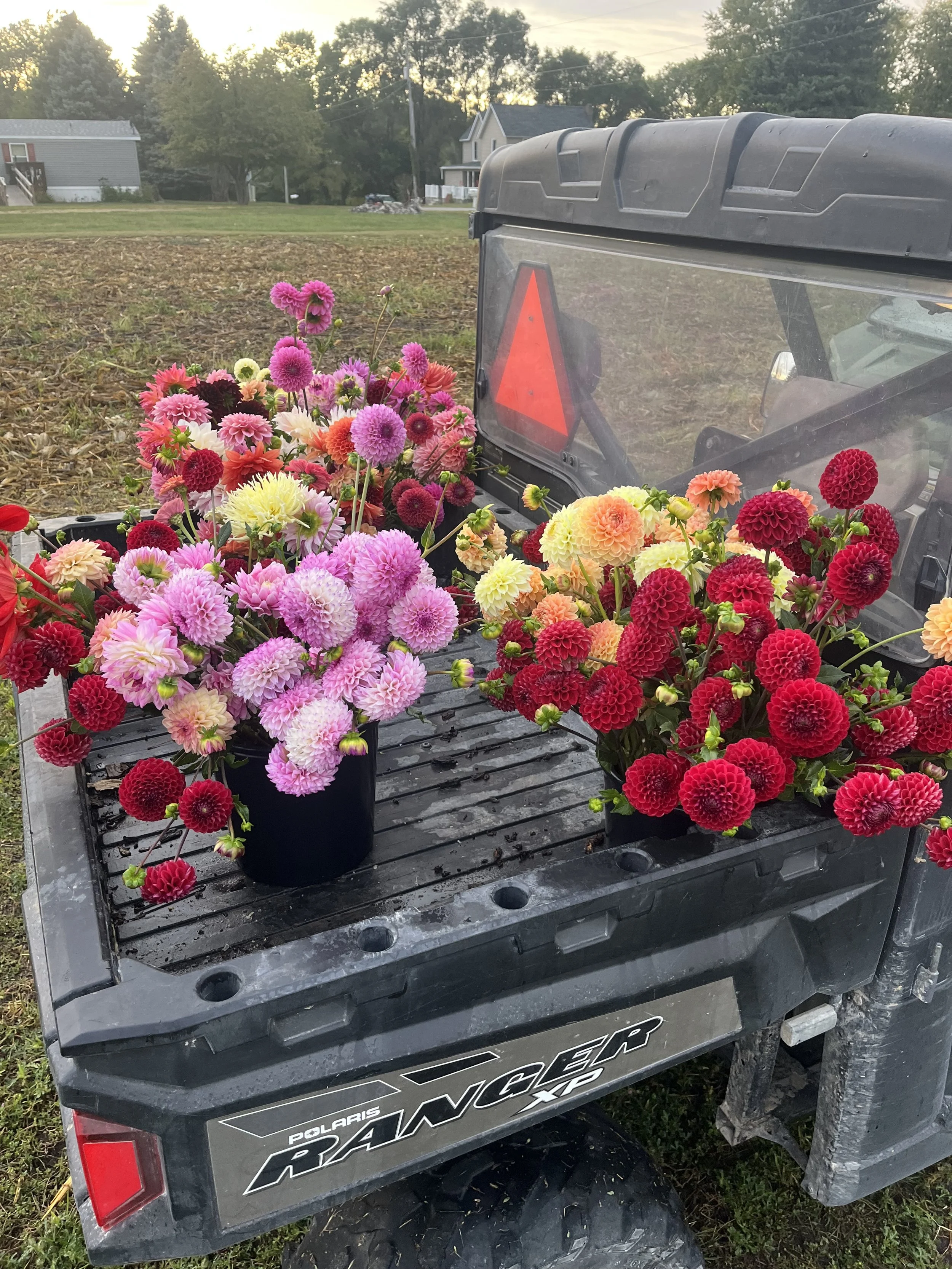 Various colorful flowers in pots loaded onto the back of a Polaris Ranger XP utility vehicle in an outdoor setting with a grassy and plowed field, trees, houses, and a cloudy sky in the background.