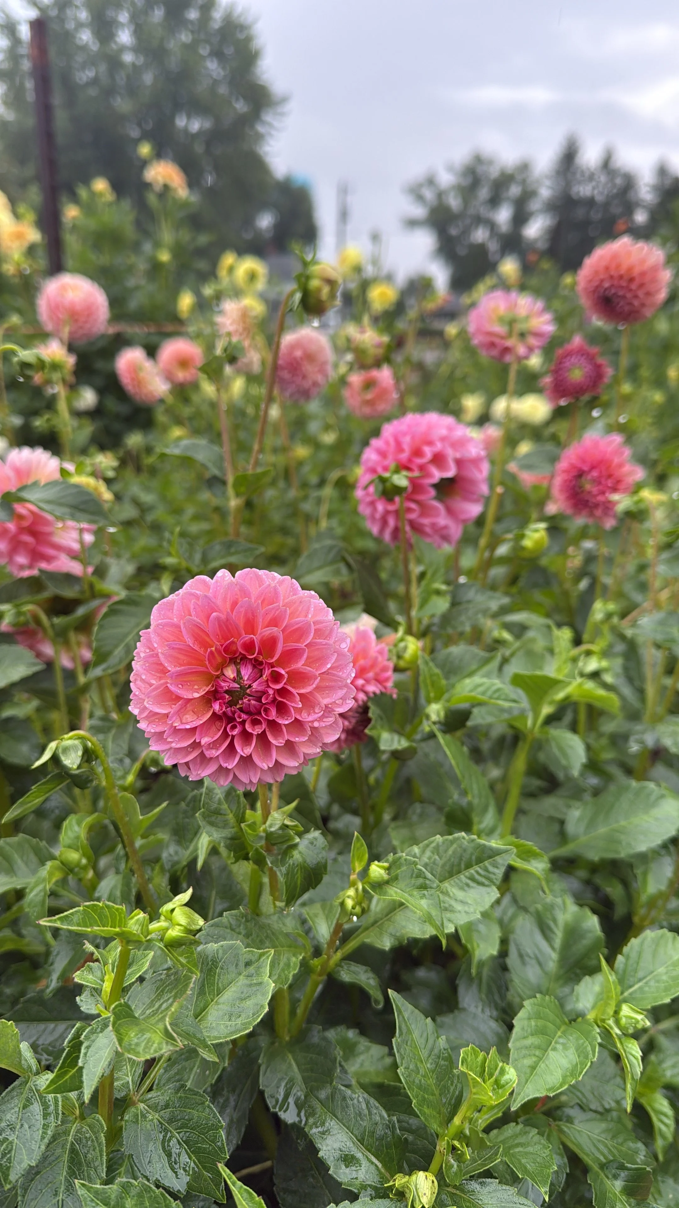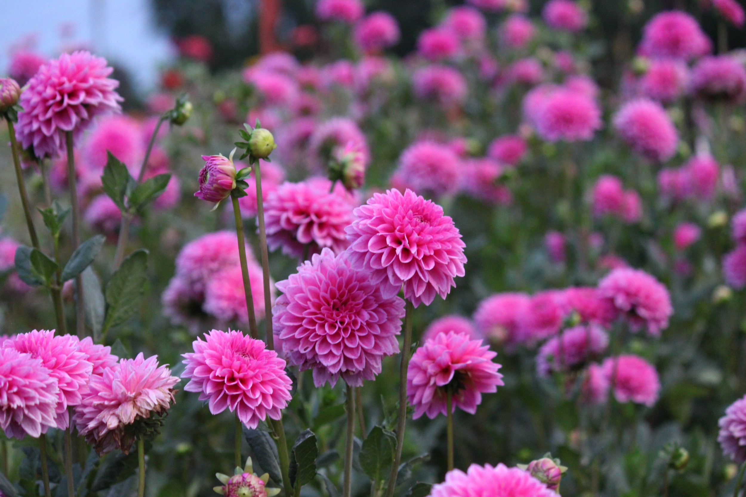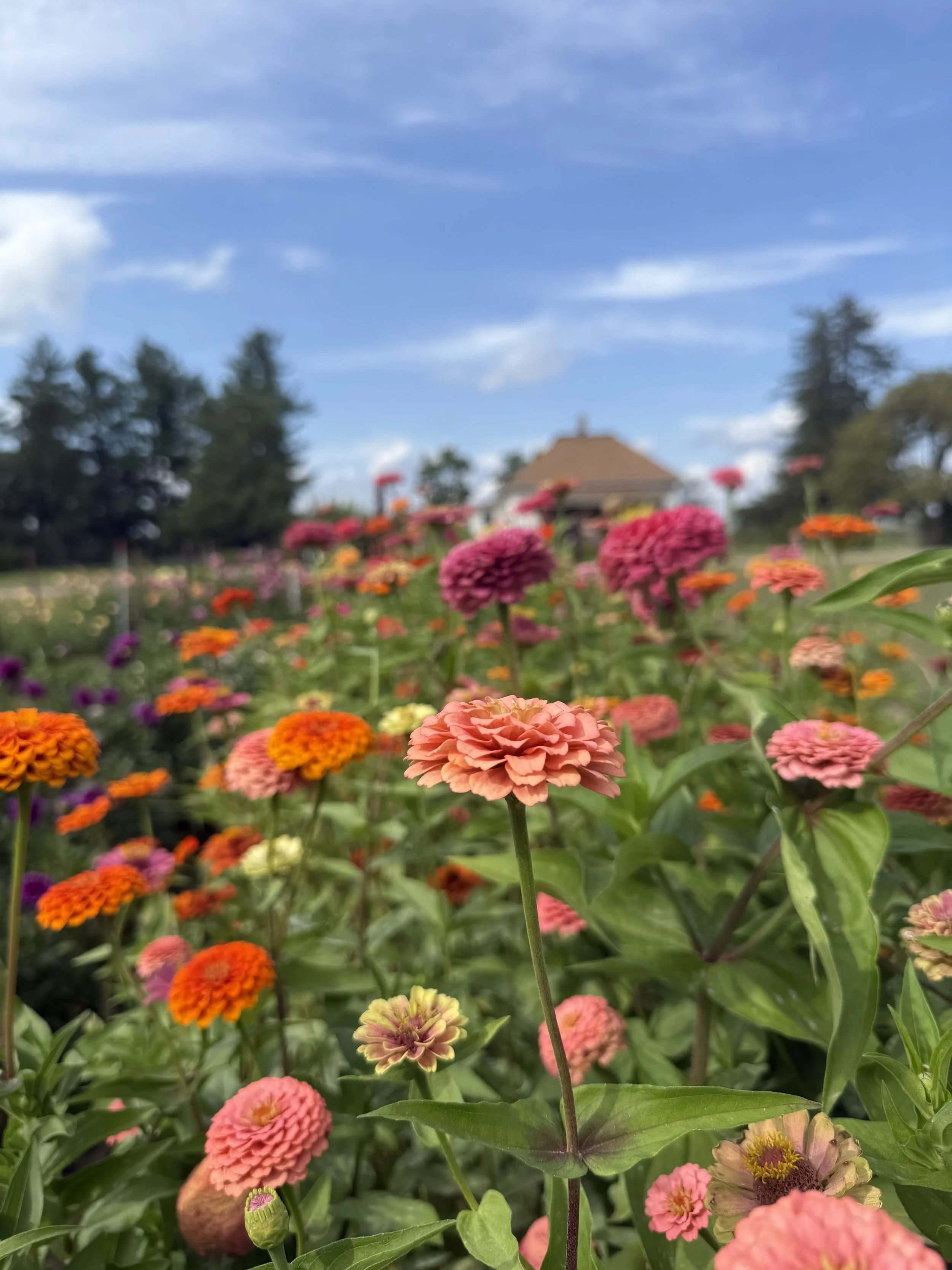 A close-up view of a colorful garden filled with pink, orange, purple, and red flowers under a partly cloudy sky, with trees and a house in the background.
