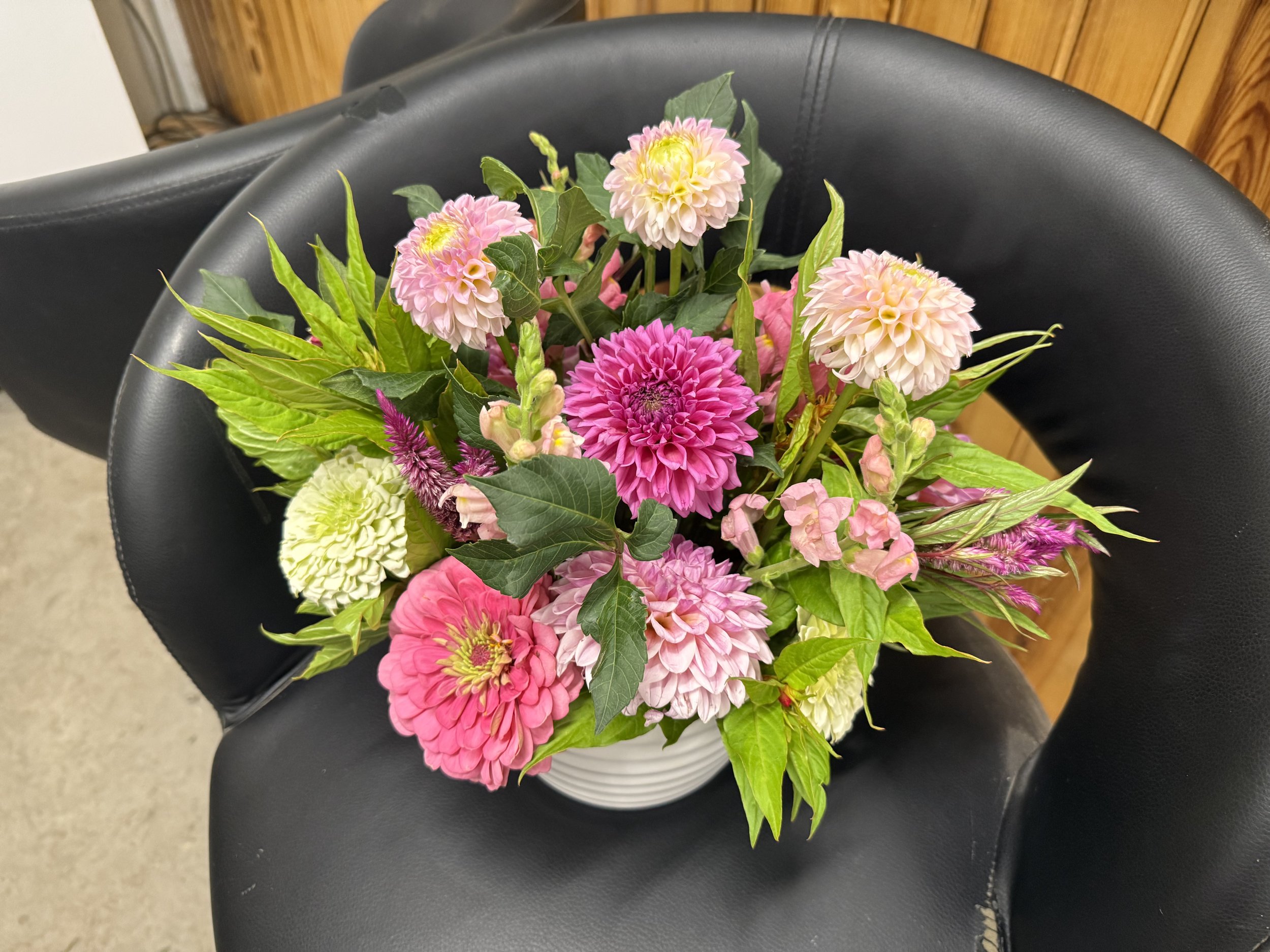 A bouquet of pink, white, and purple flowers in a white vase placed on a black chair.