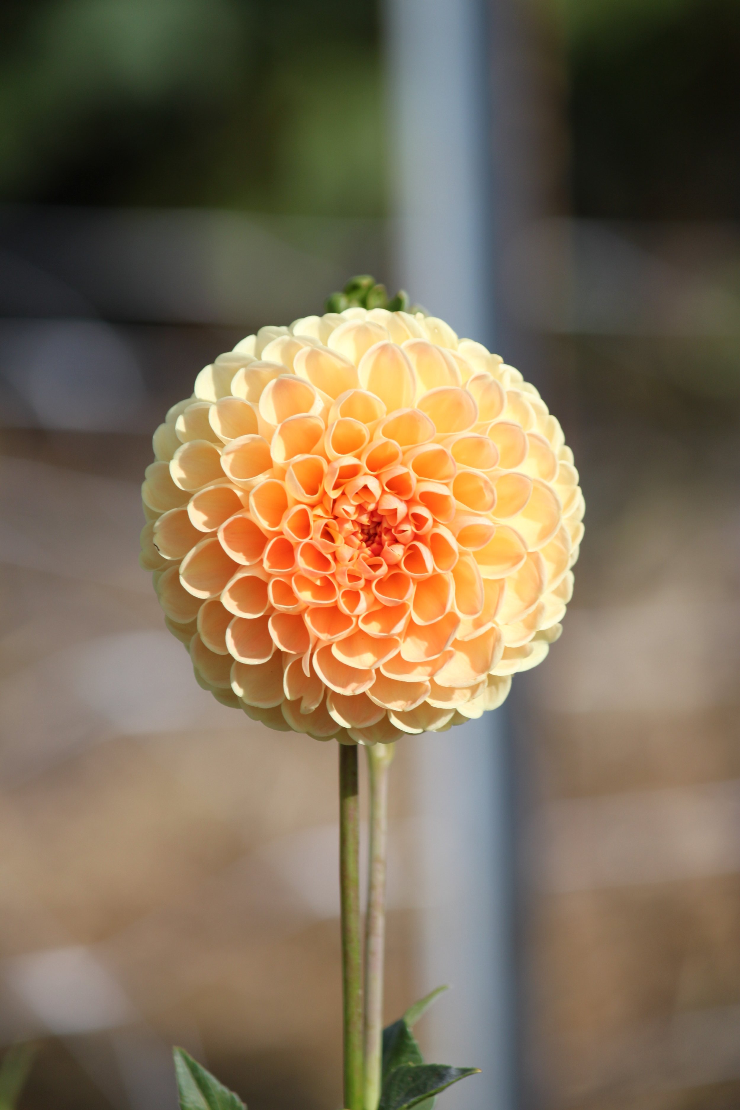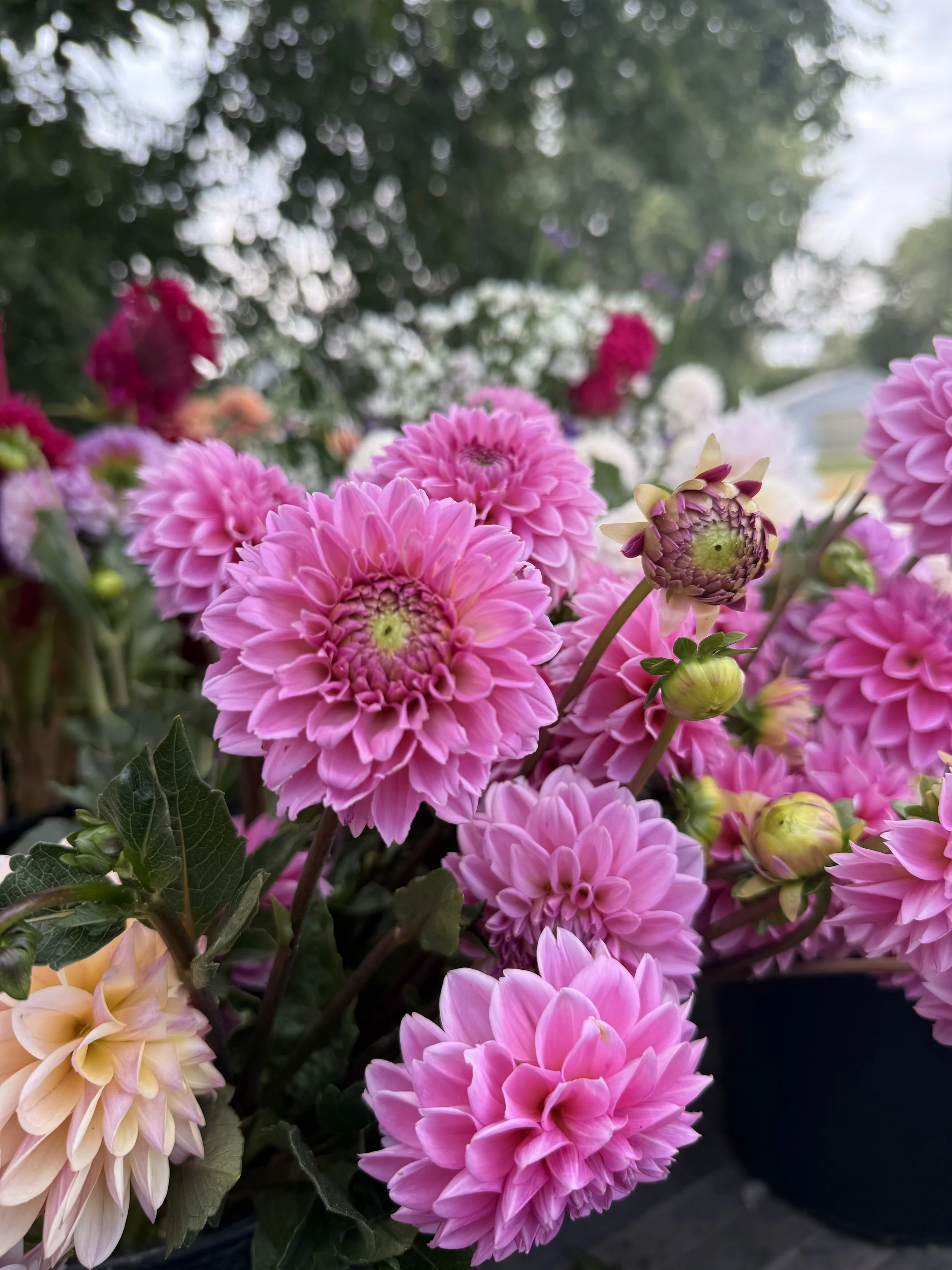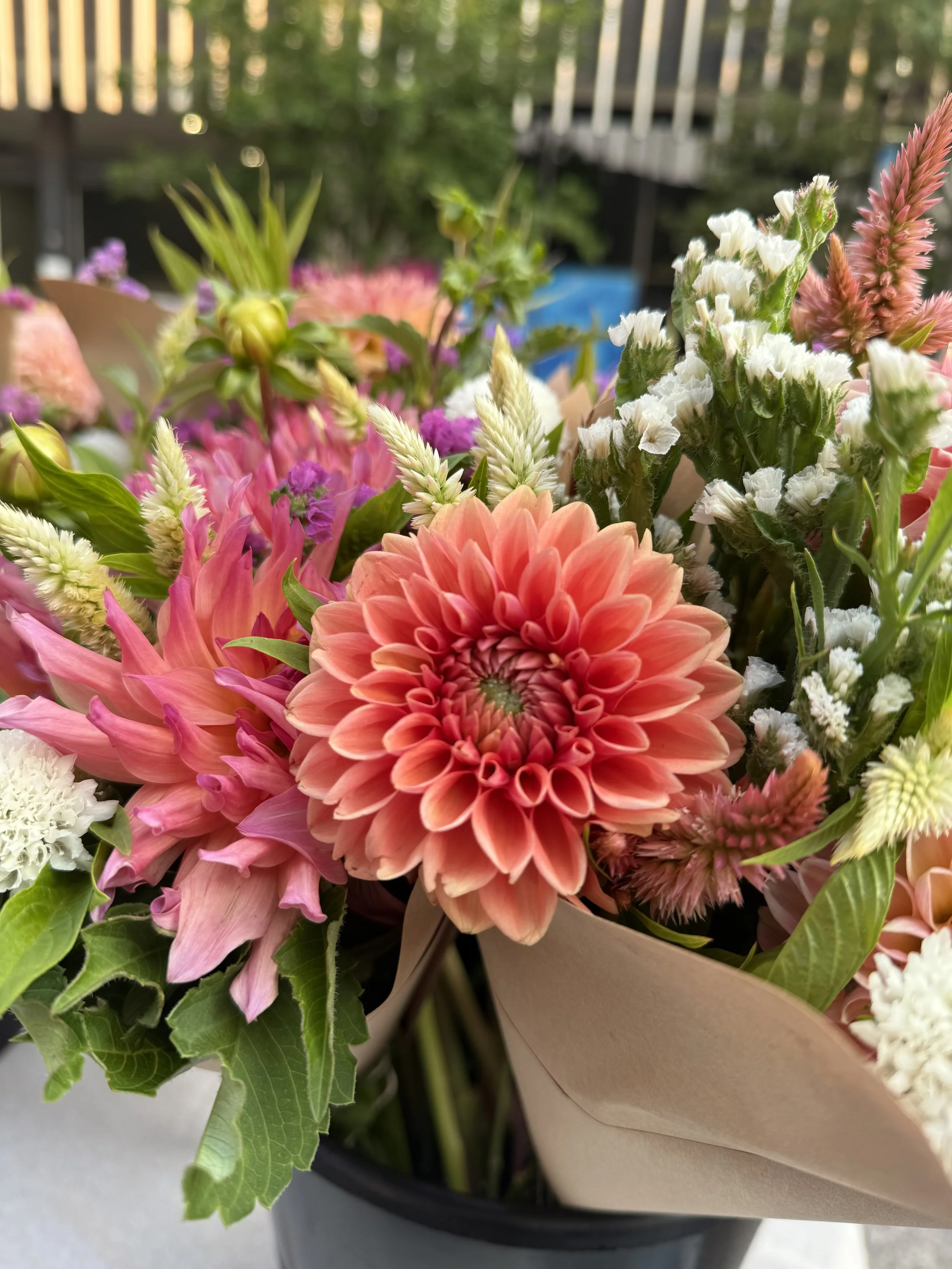 Close-up of a colorful bouquet of various flowers, including a large peach-colored dahlia, pink roses, white and purple filler flowers, with a blurred outdoor background.