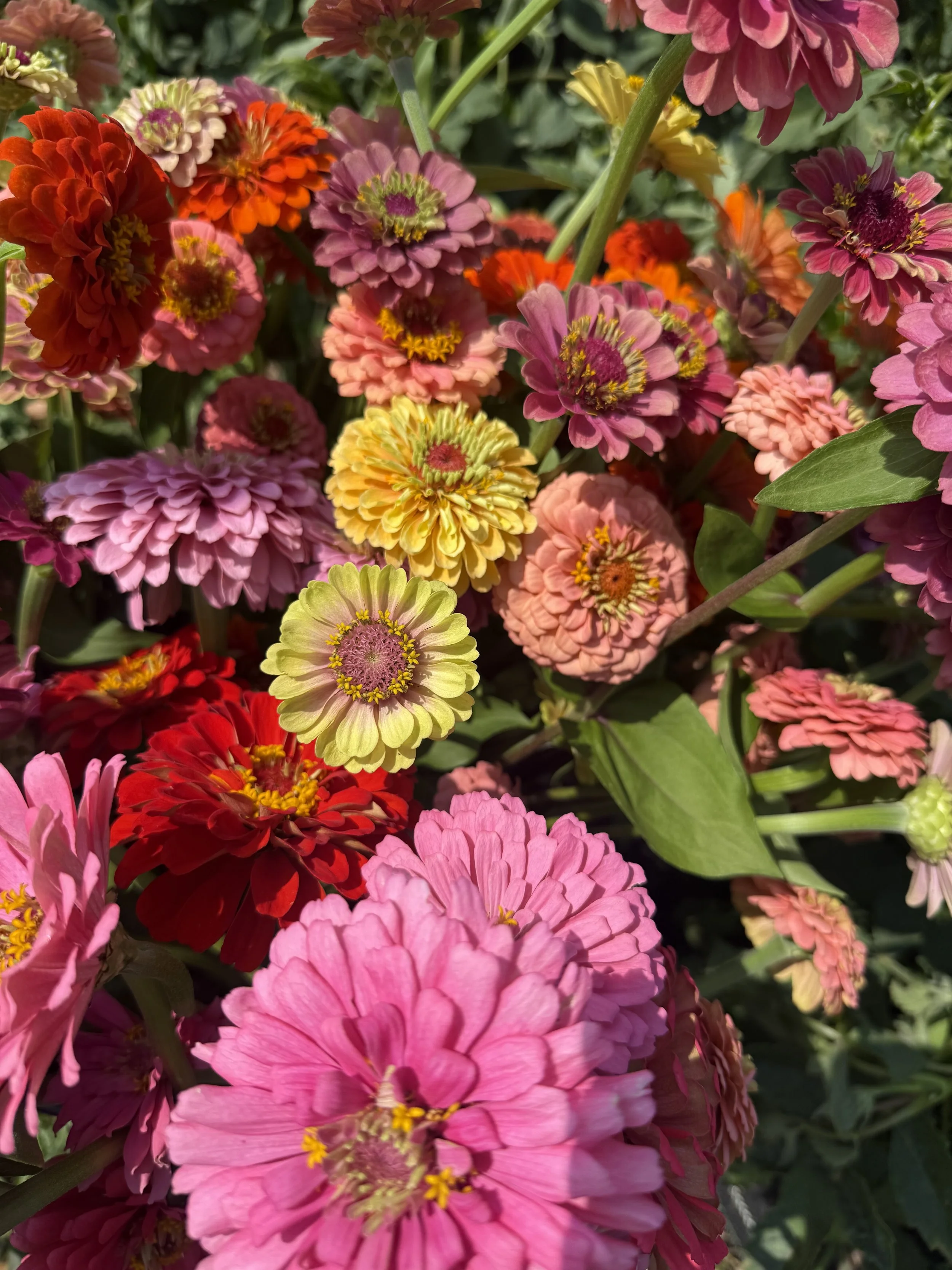 Close-up of colorful zinnia flowers in pink, red, yellow, orange, and purple.
