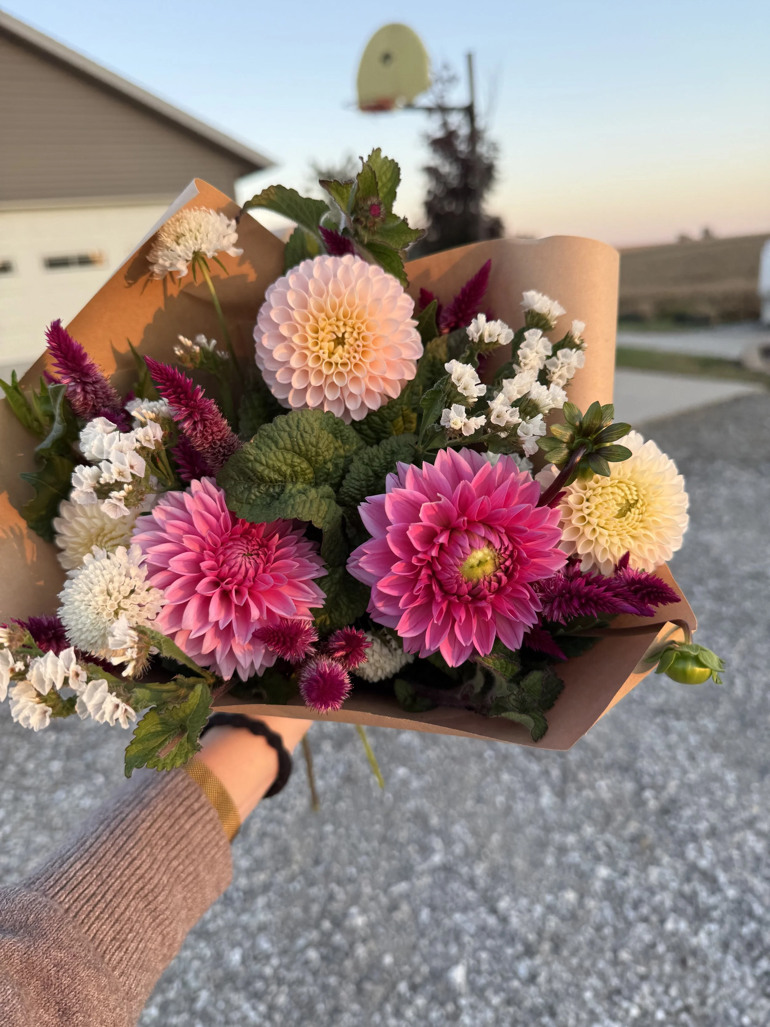 Hand holding a bouquet of pink, white, and yellow flowers against an outdoor background with a house, a basketball hoop, and a sunset sky.