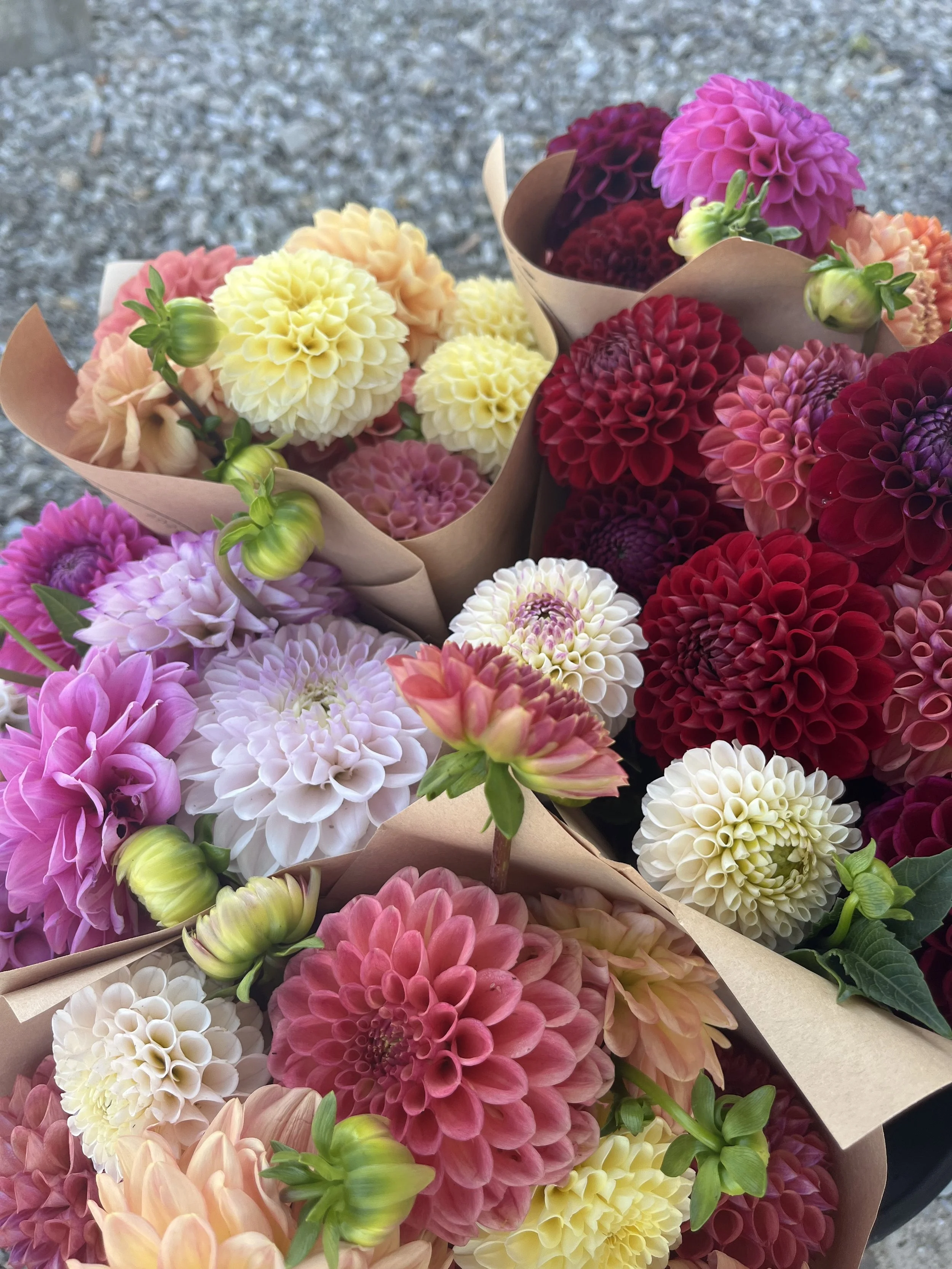 Colorful bouquets of various recently-cut dahlias in shades of pink, red, yellow, purple, and cream, wrapped in brown paper, on a gravel surface.