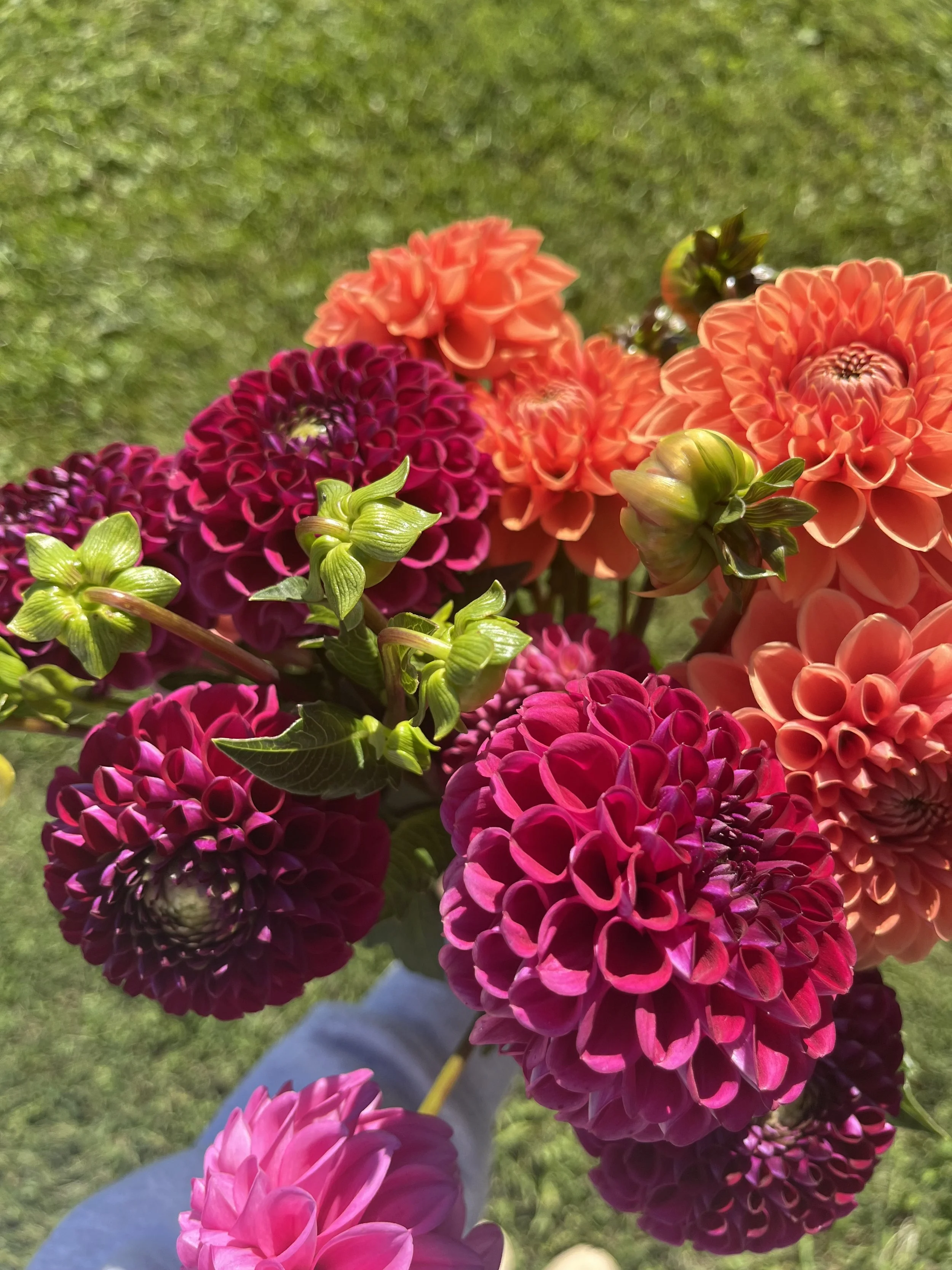 Close-up of a bouquet of colorful dahlias, including purple, pink, orange, and red flowers, against a grassy background.