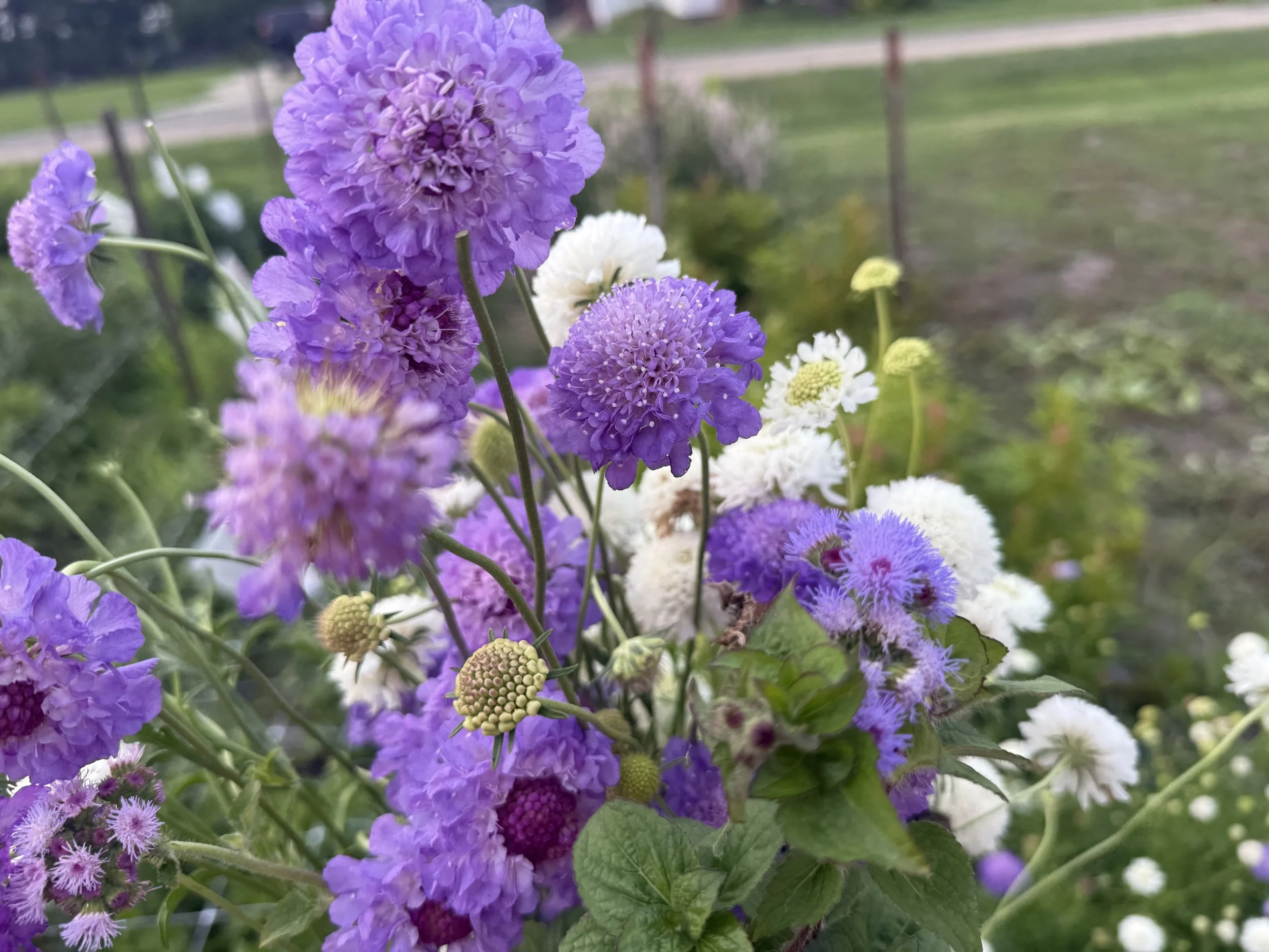 Close-up of a colorful bouquet of purple and white flowers in a garden with a fence in the background.